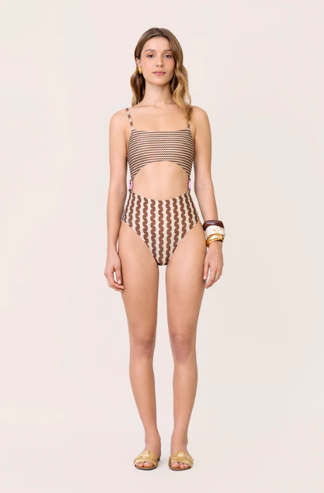 Vestido de baño entero Felici, en tonos dorado y chocolate, colores que nos evocan nostalgia, movimiento y frescura, haciendo de esta prenda una expresión auténtica de personalidad y estilo. los detalles de argollas laterales en tono rosa, elaboradas manualmente por artesanas de la región, aportan un acento delicado y significativo que realza su carácter único. versátil y audaz, una pieza que puedes usar para la playa o combínalo como body en diferentes ocasiones, creando un look etéreo, con fuerza y distinción. diseñado para mujeres que disfrutan resaltar con naturalidad y sofisticación, y que valoran las piezas que cuentan historias, únicas, auténticas y llenas de intención.