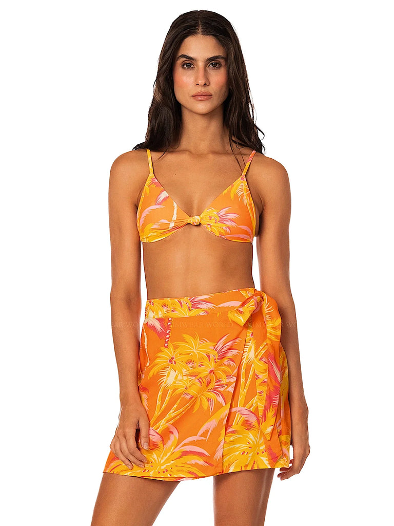The Dara Skirt features a vivid tropical floral print in vibrant orange, pink, and yellow tones, creating a bold and summery aesthetic. This wrap-style mini skirt ties at the side, offering a flattering fit and playful movement. Its breezy silhouette makes it a versatile piece ideal for layering over swimwear or pairing with resort-ready separates.