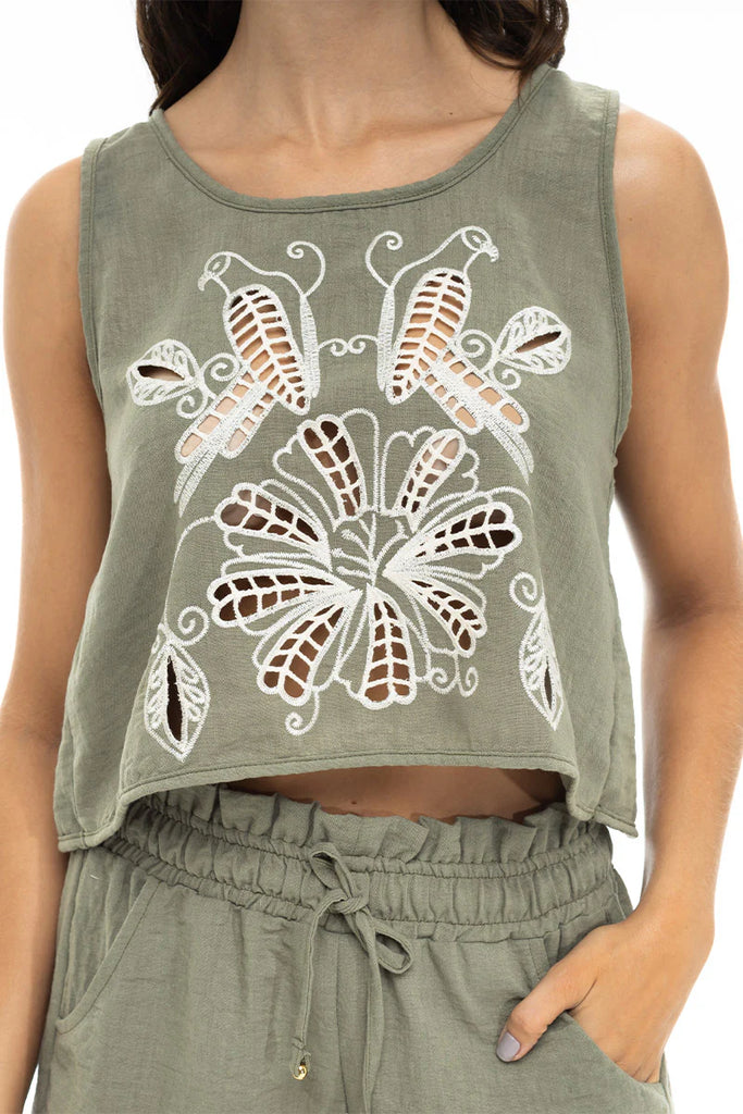 Crop Top, verde con un precioso bordado como protagonista, de semi fit corto y abertura en la espalda. Una pieza fresca que puedes combinar con prendas de tu armario y usar en diferentes ocasiones. Explora tu creatividad!. Color, frescura, alegría y sabor con Art Deco drop!