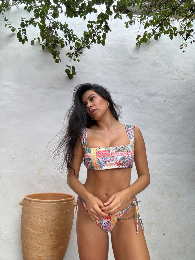 Bikini con excelente soporte al busto , tiras anchas bordadas a mano en pedrería , panty ajustable en costados